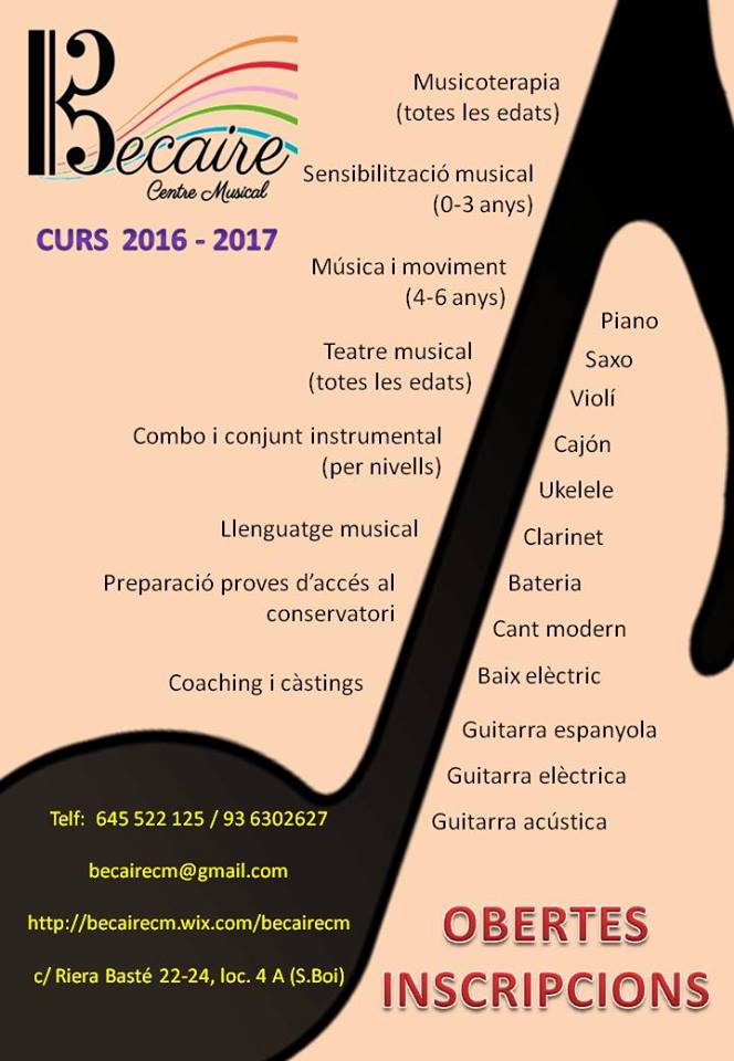 Becaire Centro Musical Sant Boi De Llobregat, nace con el fin de ofrecer en un mismo espacio diferentes enseñanzas artístico-musicales y talleres de Musicoterapia como una herramienta al servicio de la formación integral de las personas.
