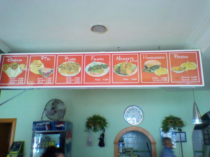 Durum / Pita / Plato / Falafel / Nuggets de pollo / Hamburguesa / Patatas.